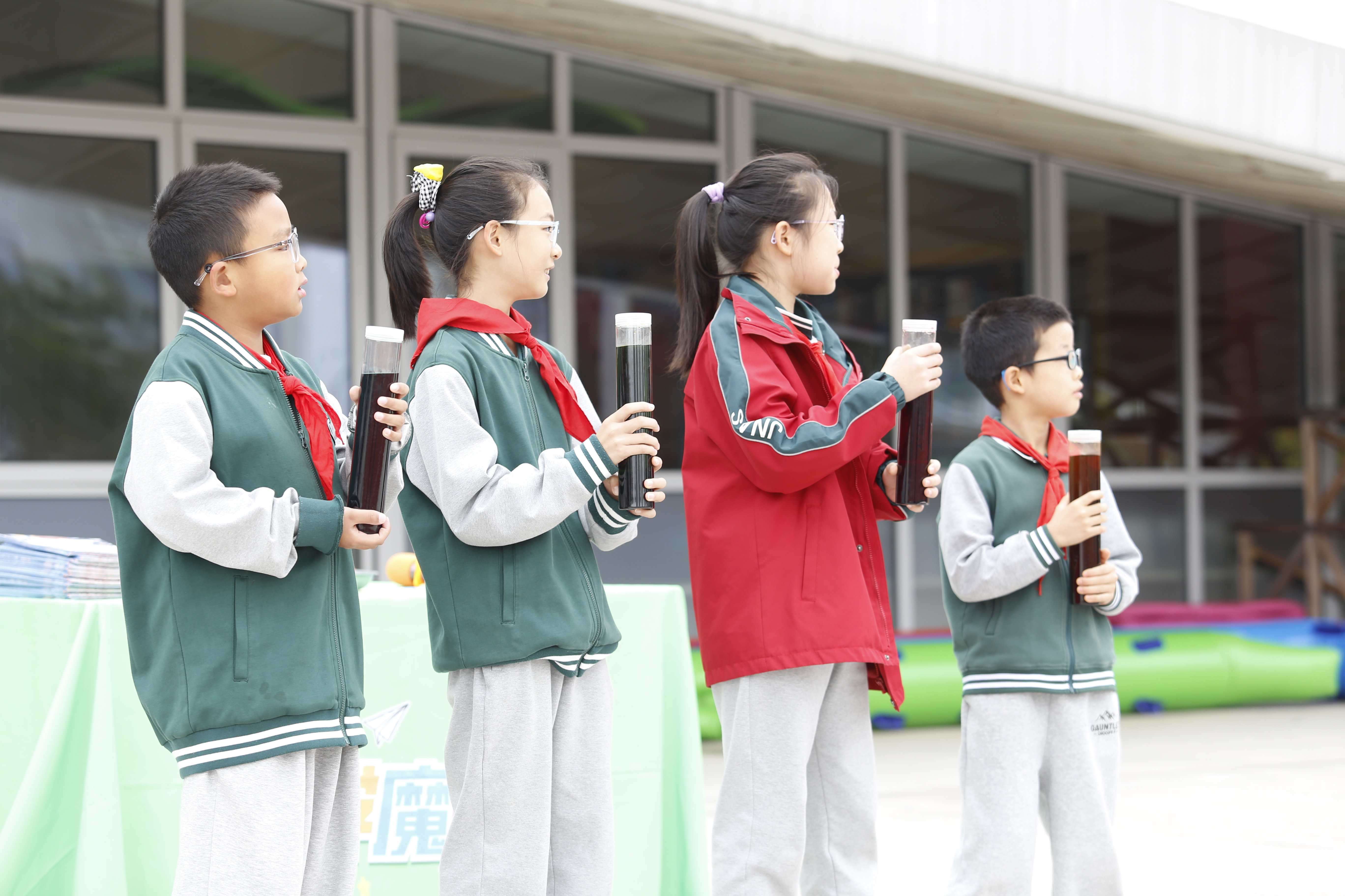 如果说机甲是“视觉冲击”,那科学魔法师的实验就是“脑力狂欢”!“摇水实验”一开场就引起了大家的好奇心:透明的水里加了点“神秘试剂”,摇一摇居然变成了红色、绿色、蓝色、再摇一摇又变回透明!“这是为什么呀?” 同学们忍不住小声讨论,魔法师笑着揭秘:“这是碘伏和VC的氧化还原反应在‘变魔术’哦!” 抽象的化学知识,瞬间变成了看得见、摸得着的奇妙现象,台下惊叹声此起彼伏。