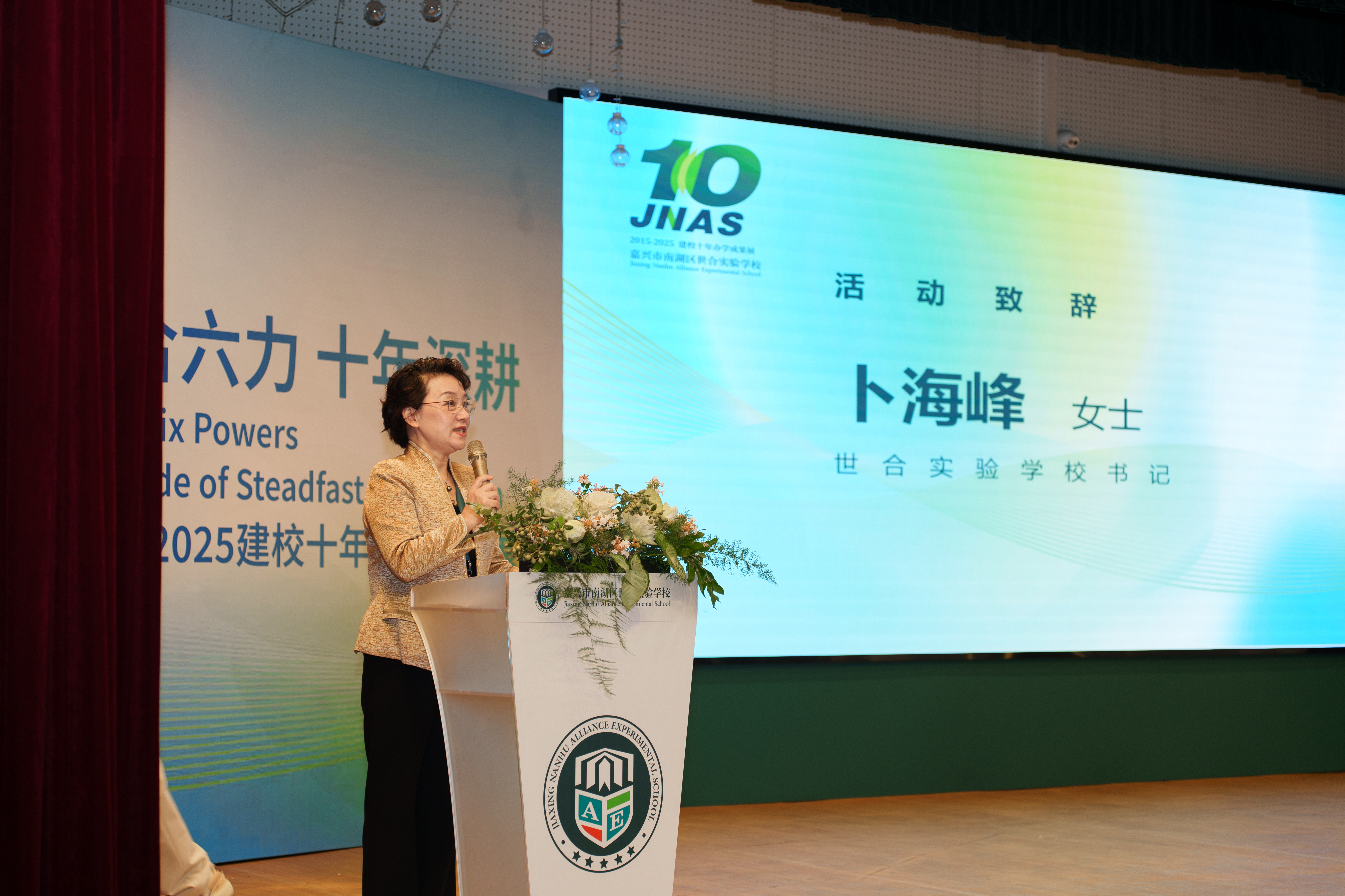 世合实验学校卜海峰书记回顾了学校自2015年从蓝图起步,让一颗理想的种子,生长为今日我们共同守护的理想家园。同时,她也对十年来与学校并肩同行、同频共振的教师和家长,以及始终给予支持与鼓励的教育同行们表达了诚挚谢意。