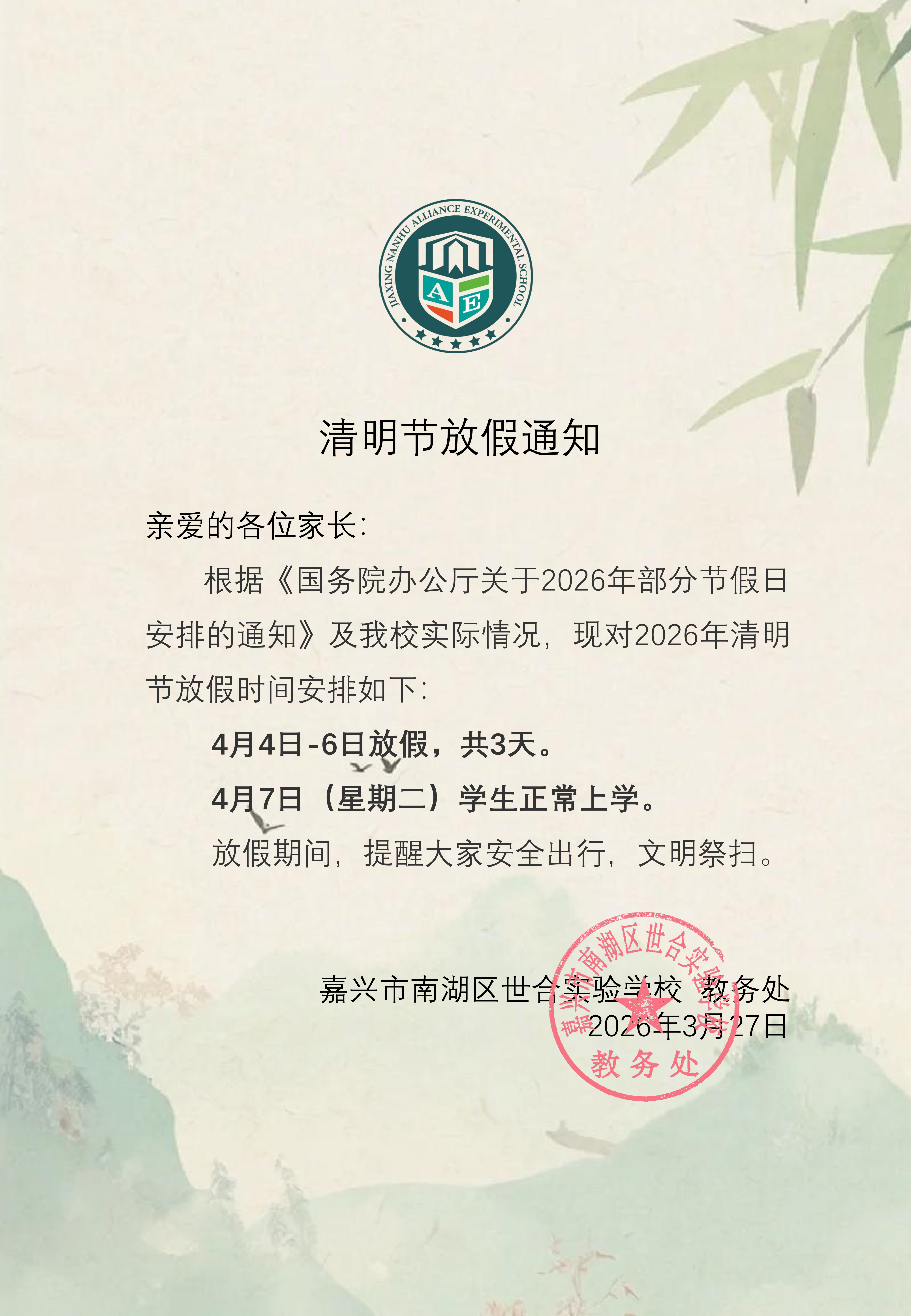 风清景明寄哀思,文明祭扫传美德。清明节是中华民族缅怀逝者、祭祀先祖、寄托哀思的传统节日,更是传承孝道文化、培育家国情怀的重要契机。根据《国务院办公厅关于2026年部分节假日安排的通知》,现将学校2026年清明节放假相关事项告知如下: